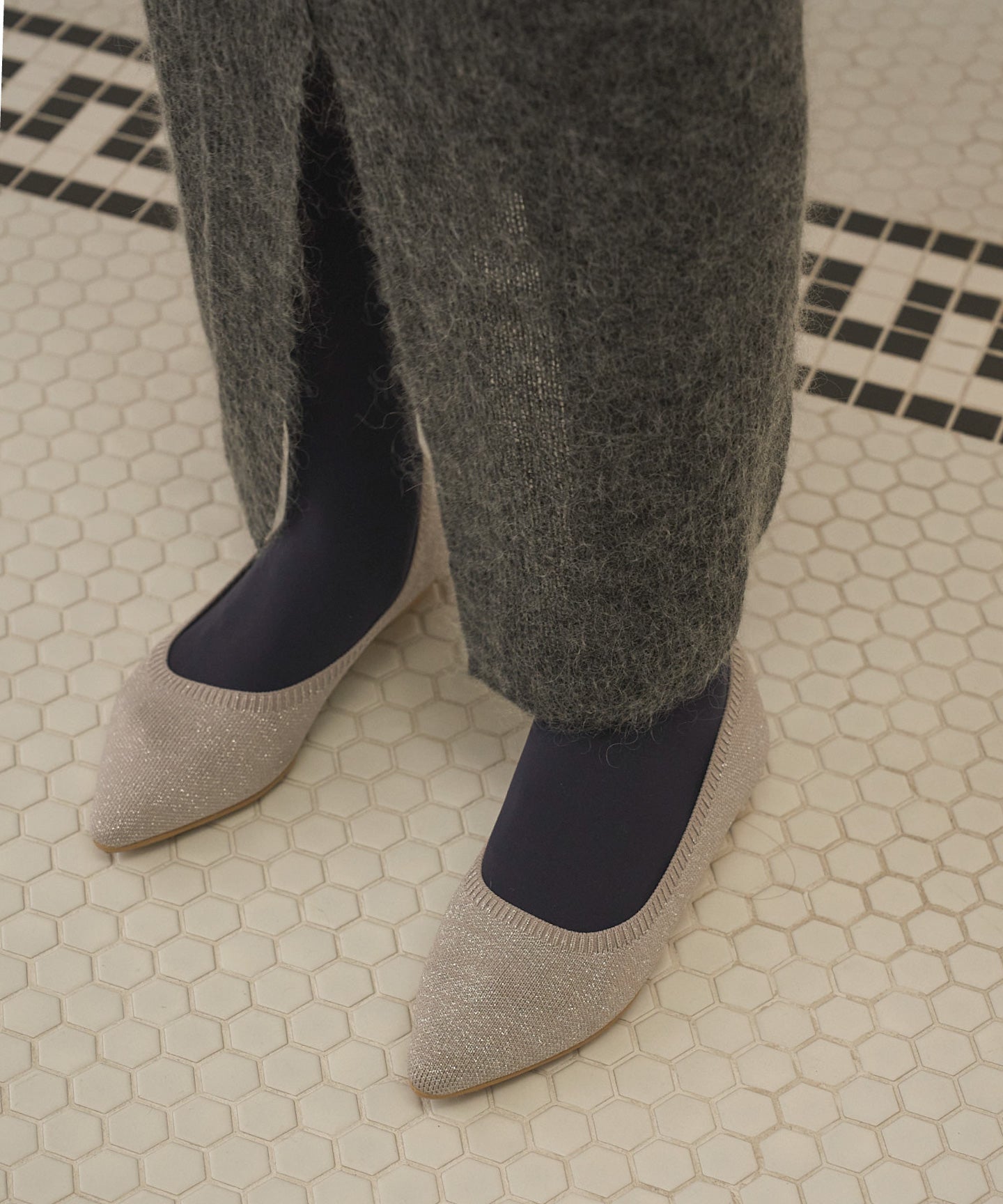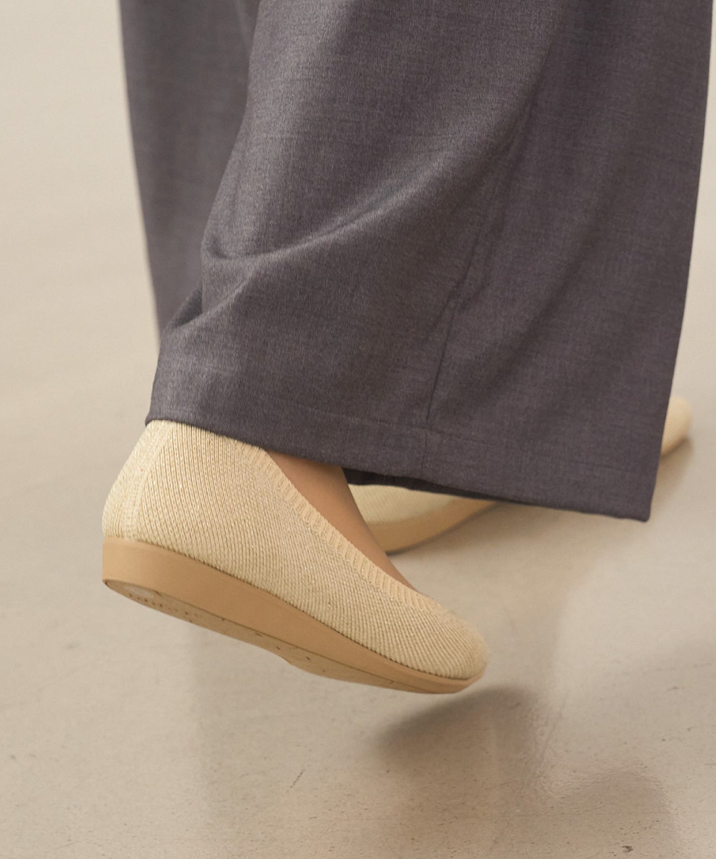 ・LIGHT WEIGHT 片足わずか120g、おおよそタマゴ2個分の軽さです。秘密は一枚仕立てのニットアッパーと発泡素材のアウトソール。軽量リサイクルポリエステルヤーンでしなやかに編みたてることで裏材や芯材を排除。アウトソールはランニングシューズのような軽さとクッション性に、パンプスのきちんと感もある絶妙なバランスにたどり着きました。