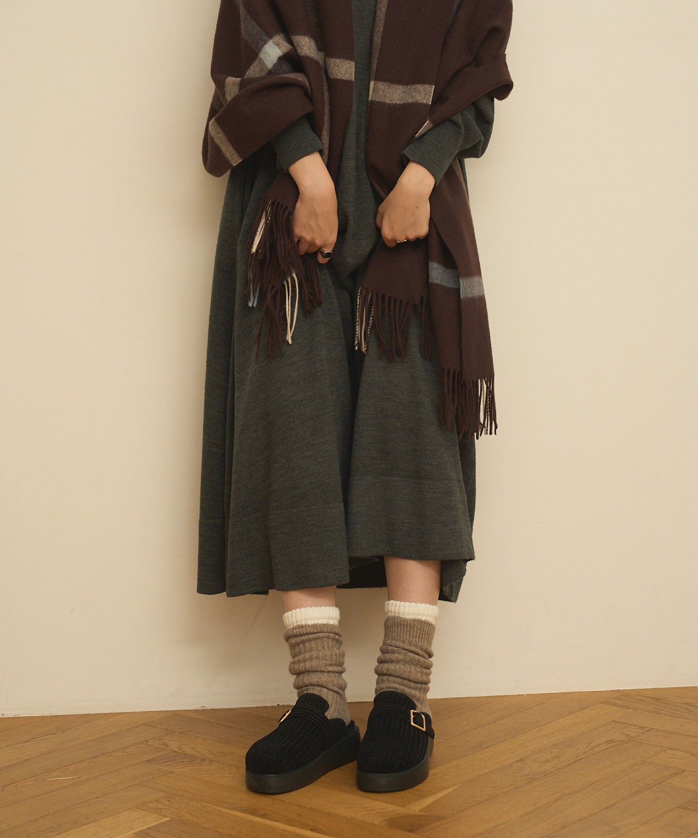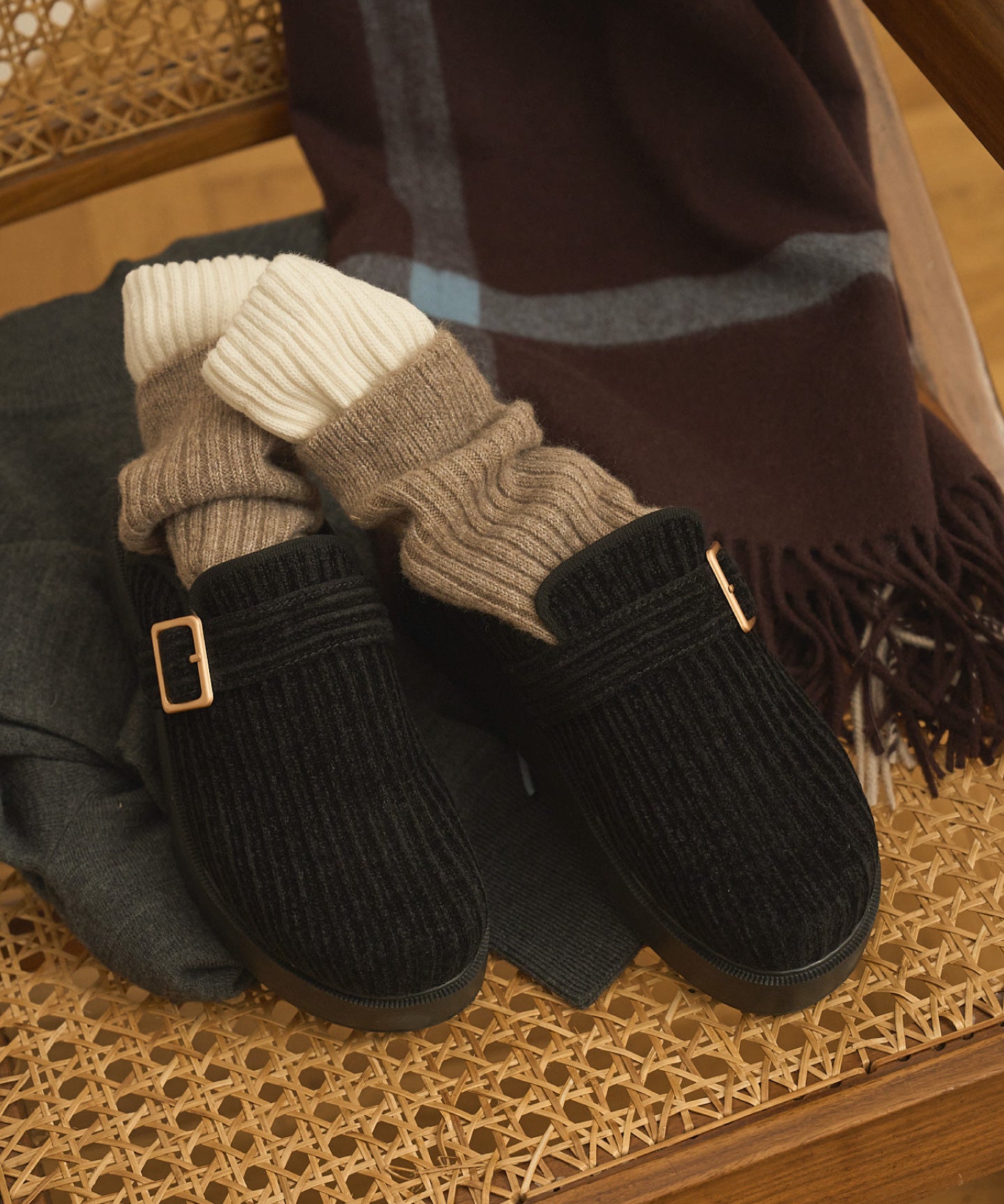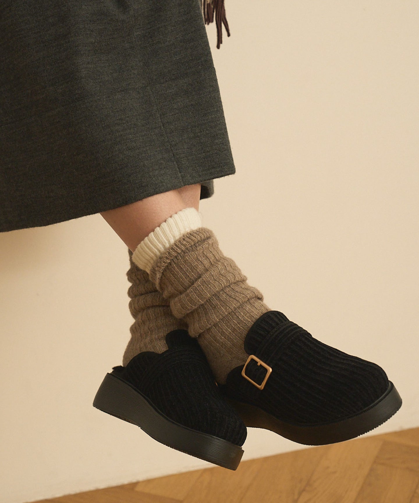 毛羽立ちのあるシェニール糸で編み立てており、あたたか味のある厚底クロッグシューズ。中敷きもファー素材になっているので、ふんわり、やさしい足あたりです。