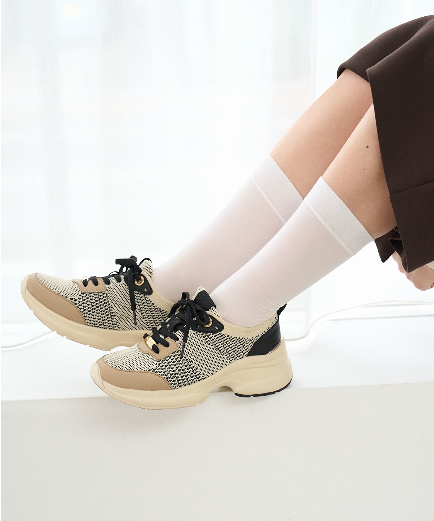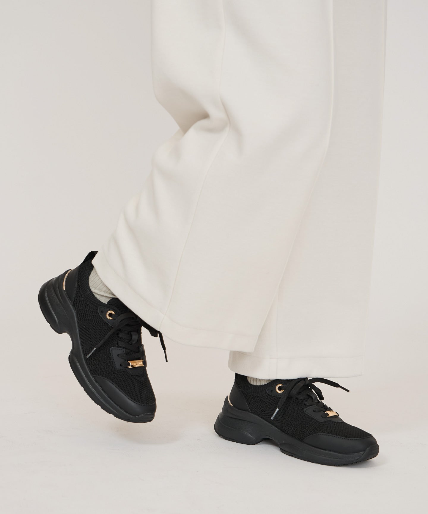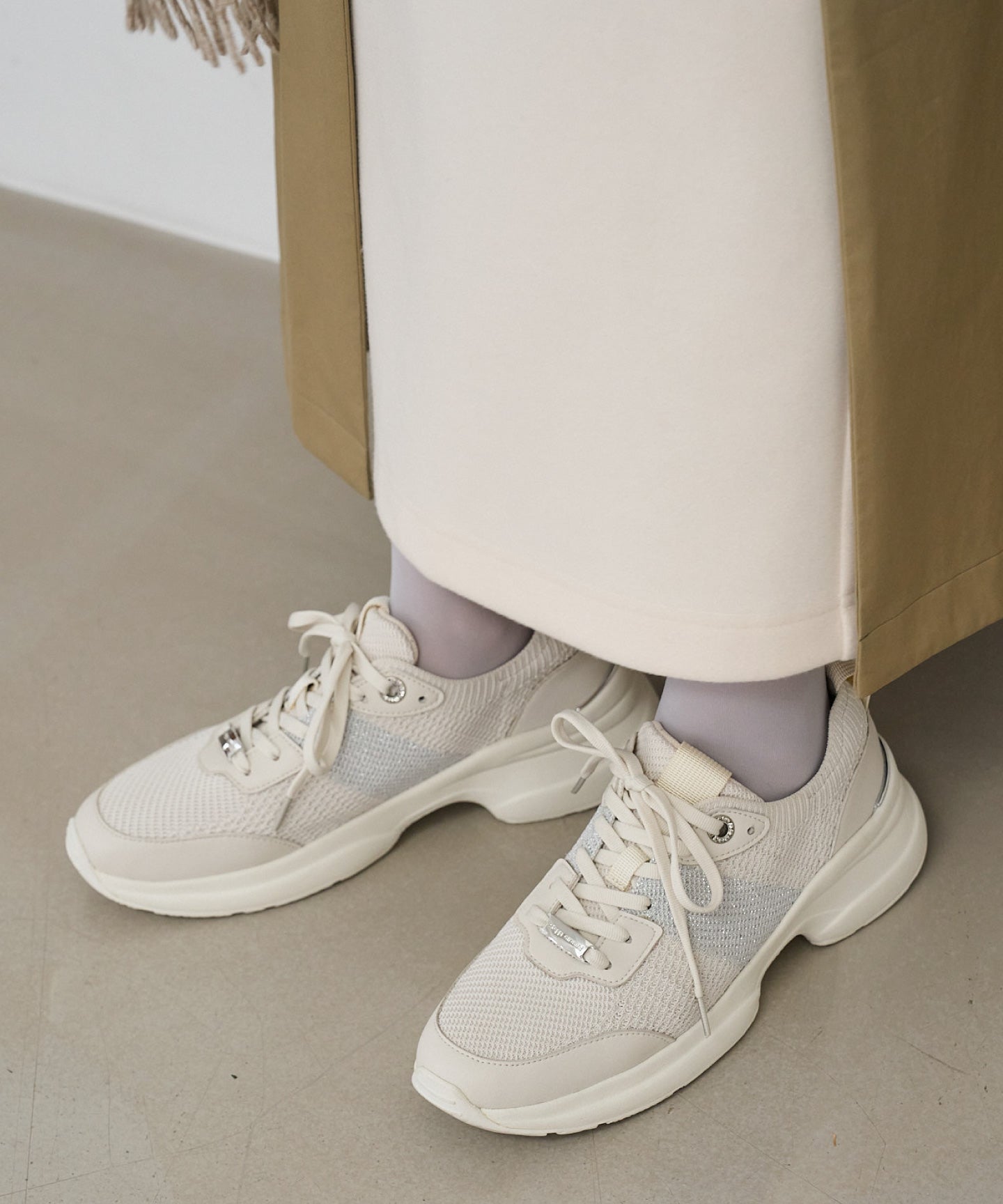 女性らしく、すっきりきれいに履ける形状で、さらに紐穴のクリスタルハトメ、メタルプレート、かかとのメタルラインがキラリと光り、上品なアクセントになっています。