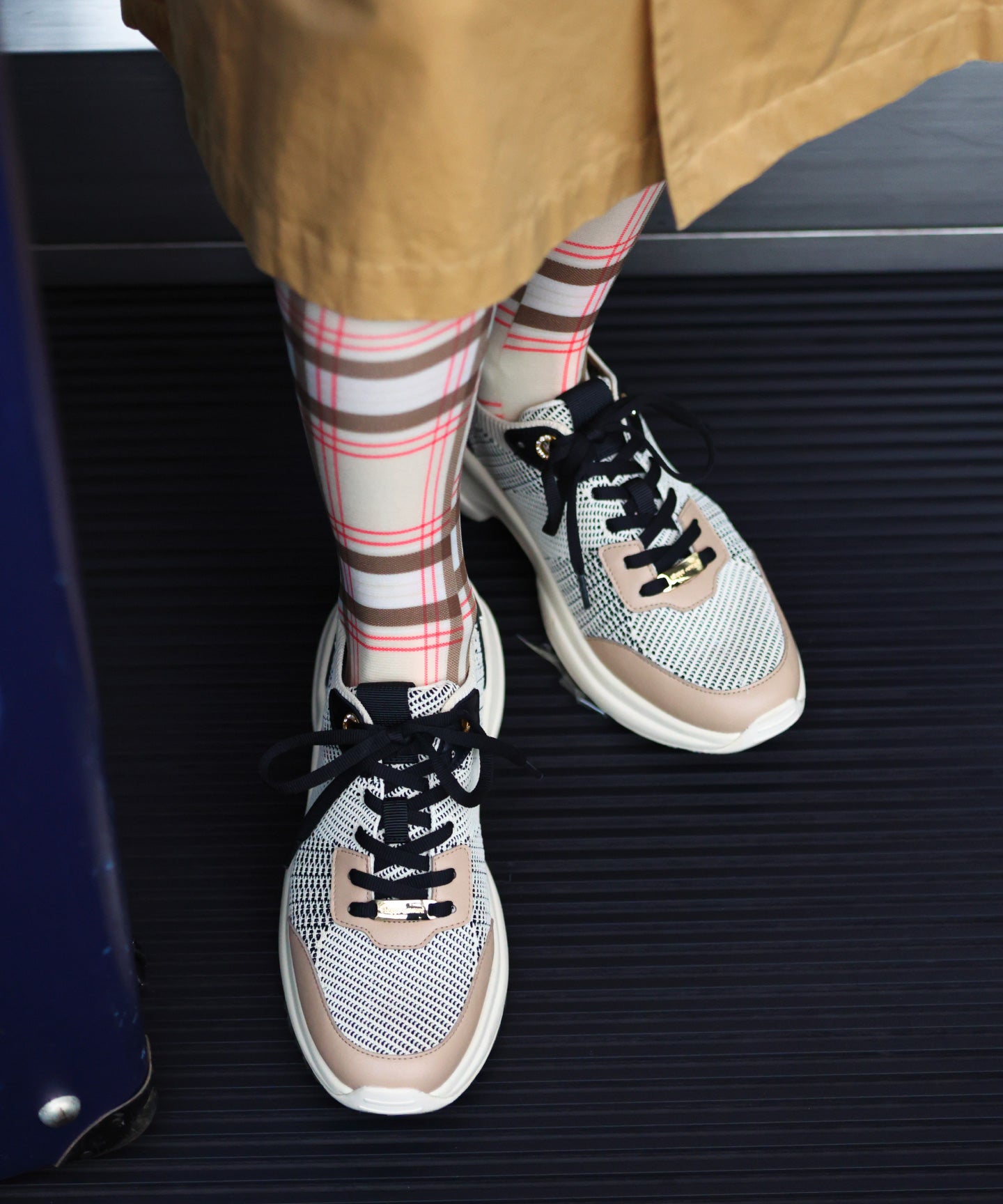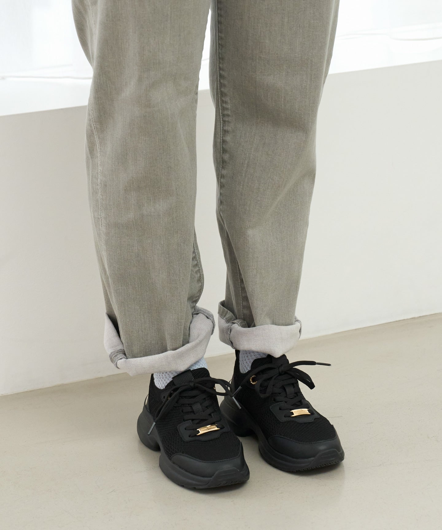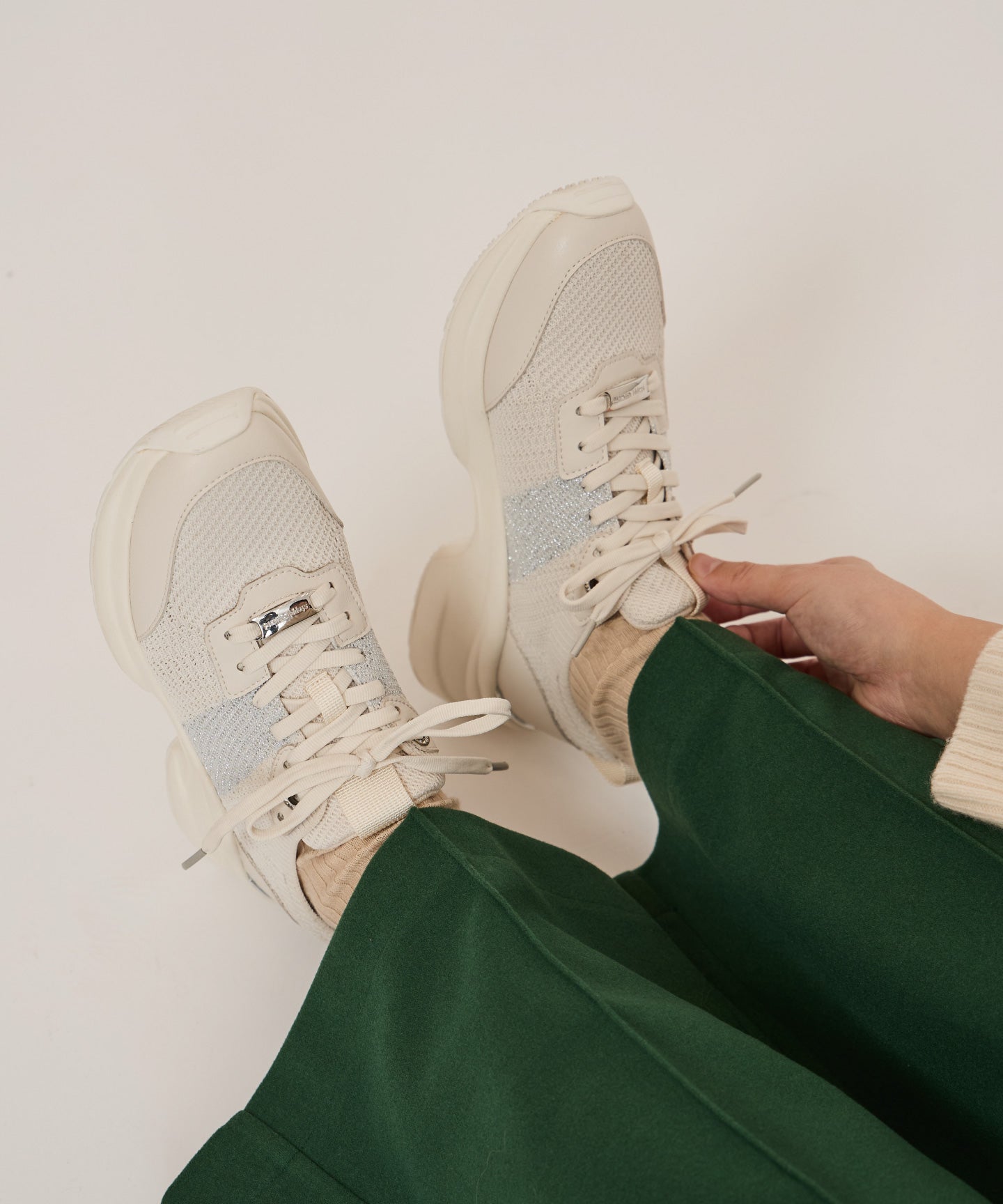 女性らしく、すっきりきれいに履ける形状で、さらに紐穴のクリスタルハトメ、メタルプレート、かかとのメタルラインがキラリと光り、上品なアクセントになっています。