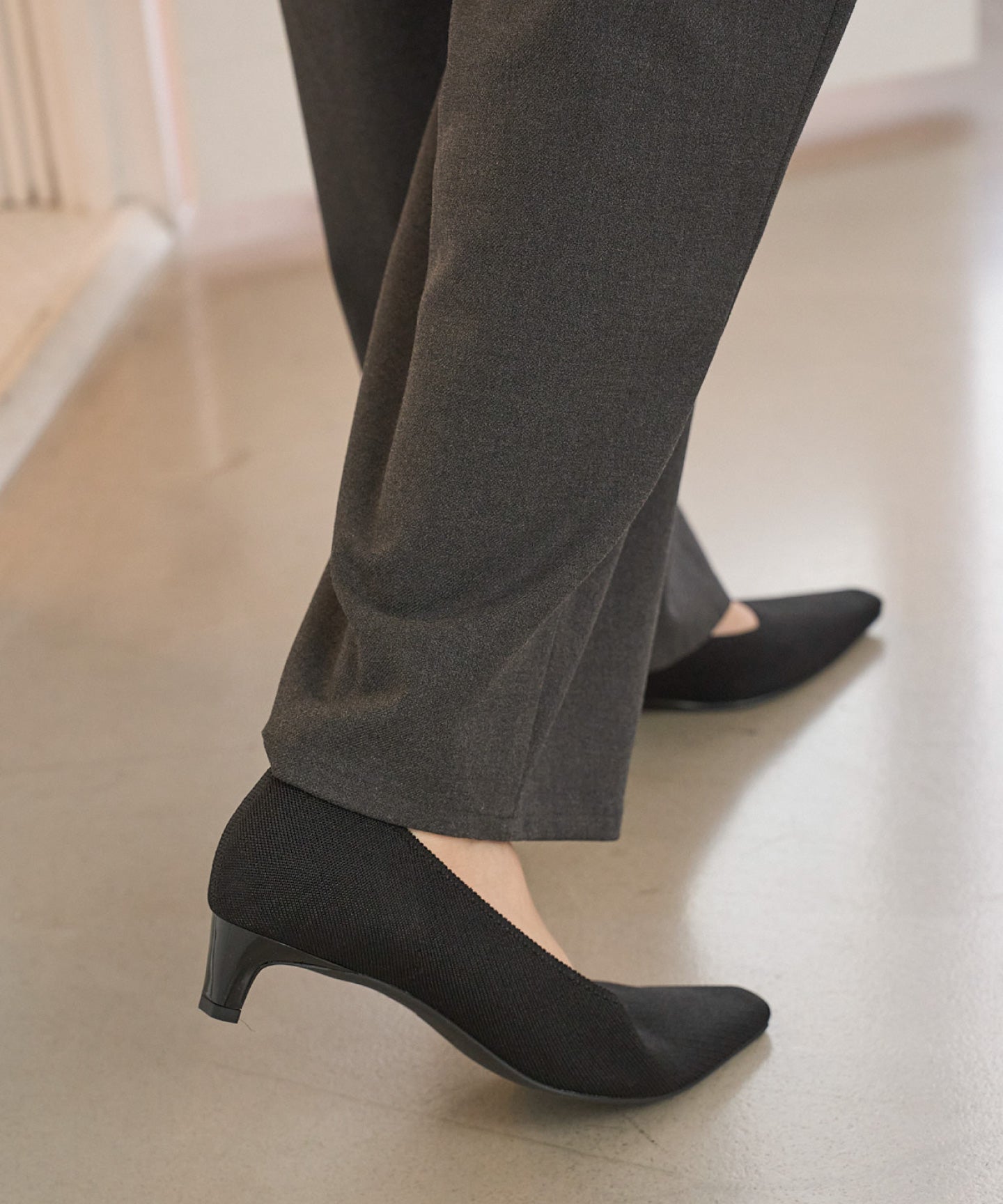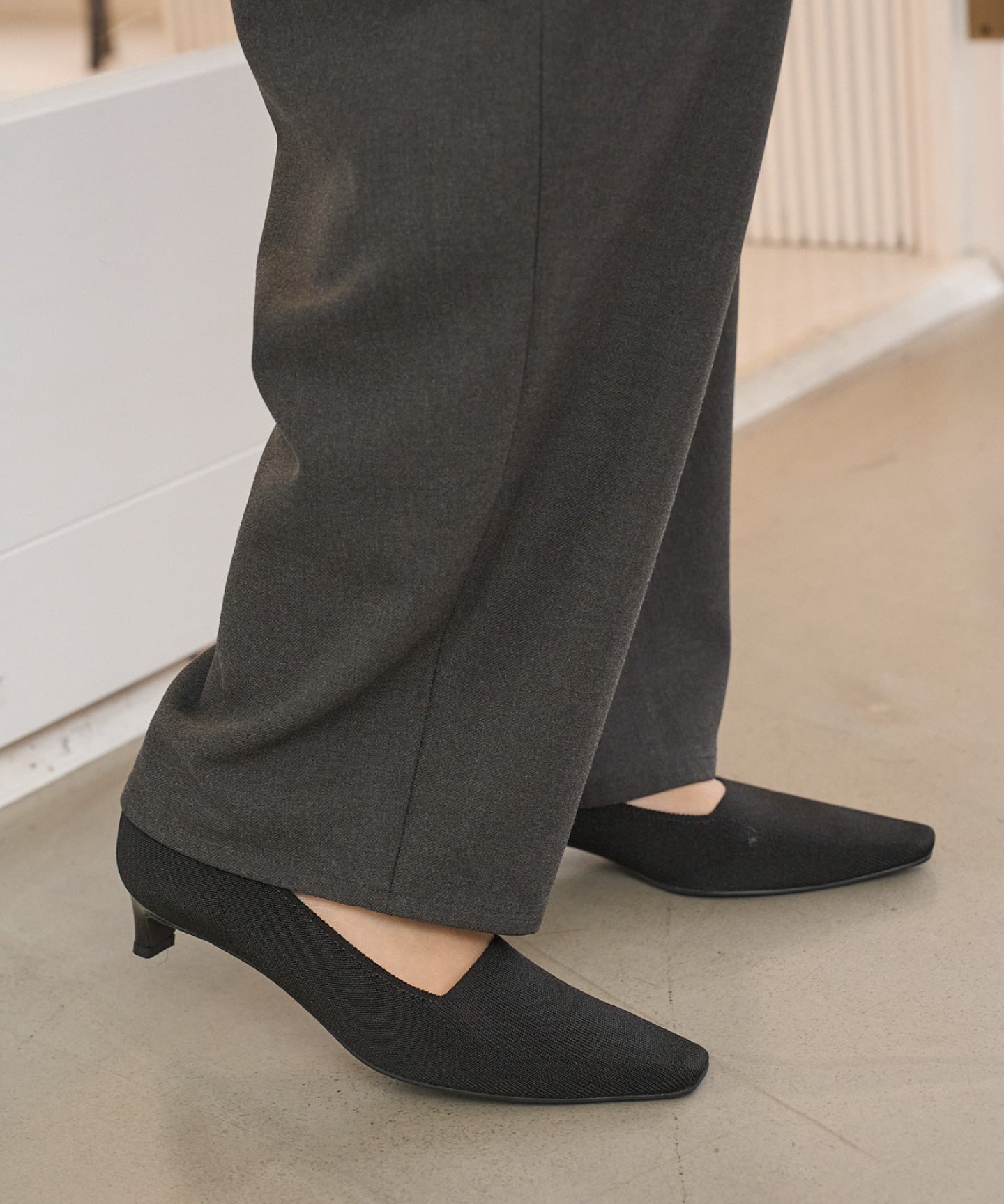 ヒールの形が少し後ろに付いているデザインのおかげか、足のラインがすごく綺麗に見えます。 実際よりもヒールが高く見えるのに、安定感はバッチリ。 ニットの伸縮性があるので、甲高な私の足にもぴったりフィットしてくれました。