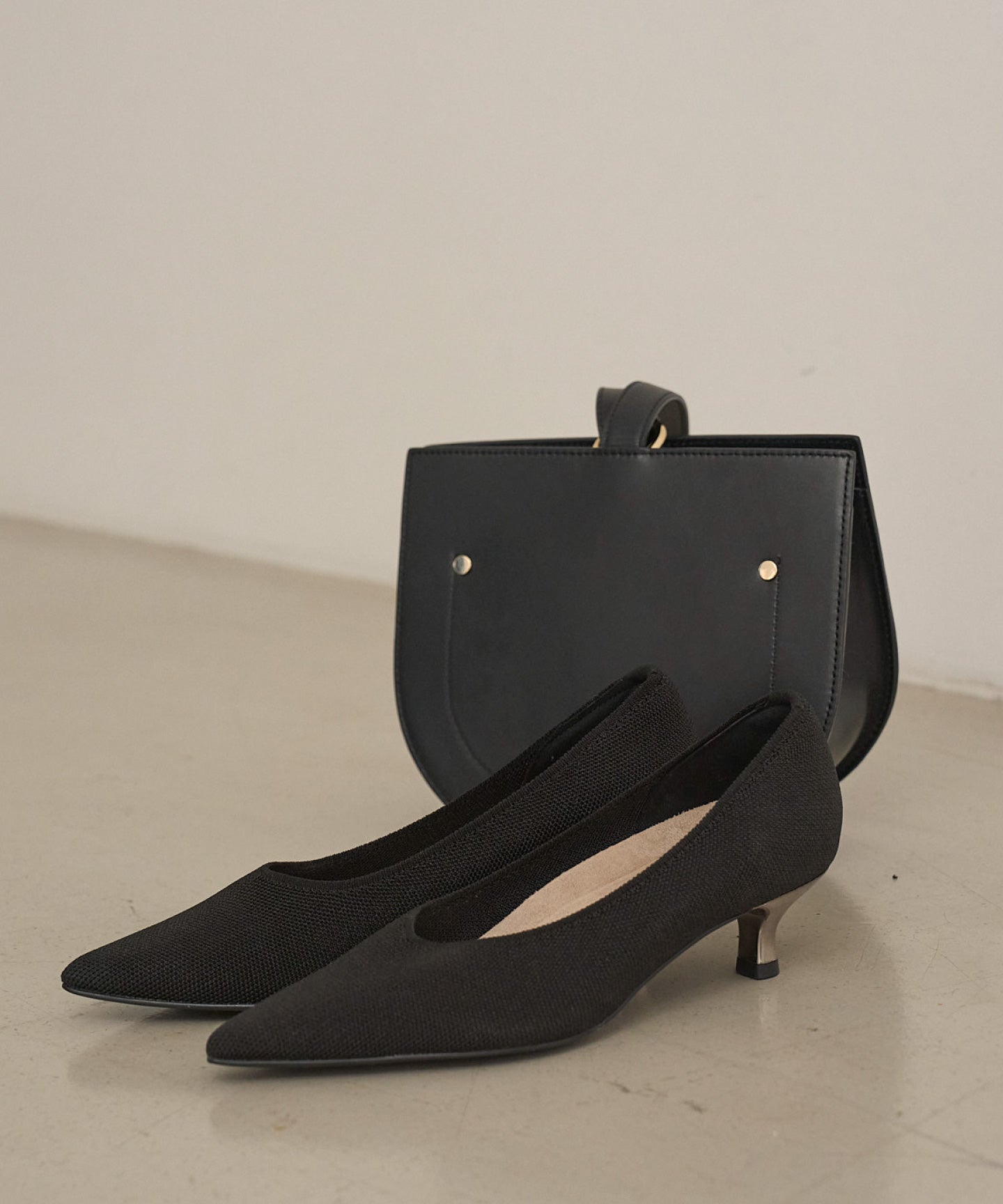 地面に向かってややフレアな形の、安定感のあるメタル調の約4cmヒールが実用的。履き口は柔らかなVラインを描きながら、甲部分をしっかりホールドする深さに設計し、緊張度が高い佇まいでもニットならではの柔らかさを感じられます。