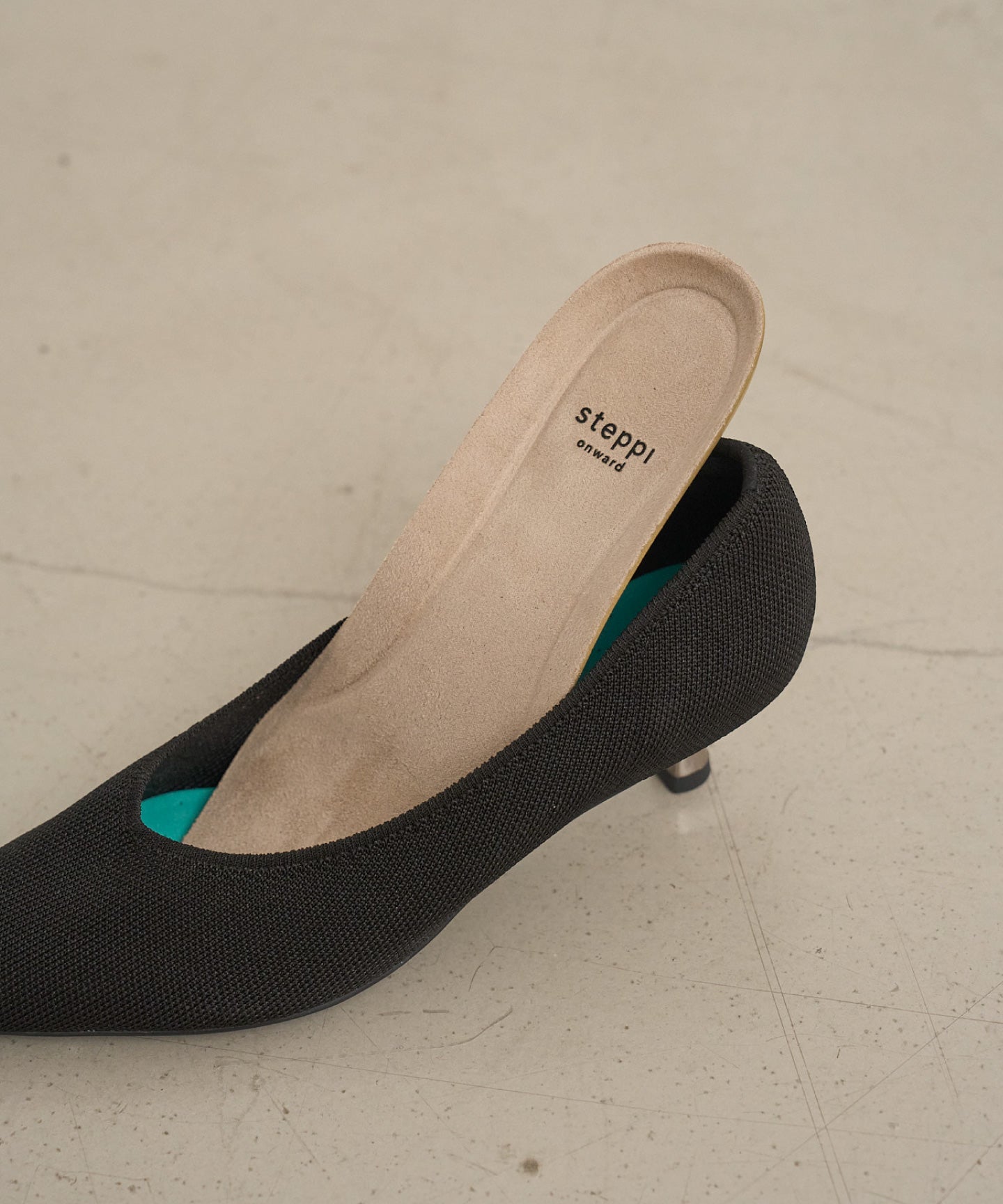ヒールパンプスは、靴の中で足が前滑りをしないジャストサイズを選ぶのが特に大切です。steppiのヒールシリーズは足を正しい位置に誘うオリジナル設計のインソールを搭載。あえてクッション性を抑えたヒールカップと適度なふんわり感のある縦アーチサポートで前滑りしにくく、正しい歩行をサポートします。